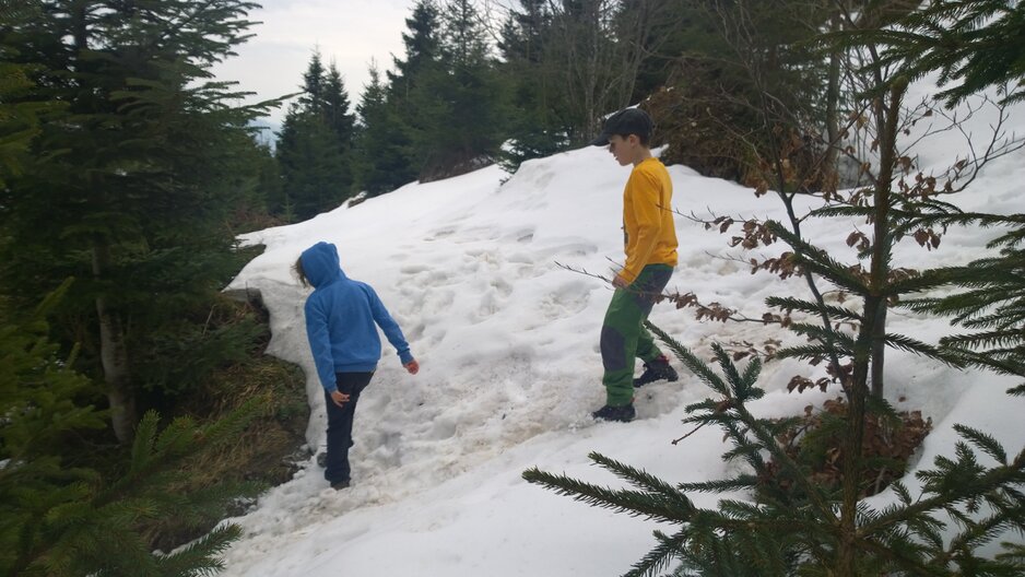 Vom Wildspitz geht es etwas runter zum Dreiländerstein. Der Grenzstein (Zürich, Zug, Schwyz) steht etwas unterhalb des Grats. Wir verlassen nun den Grat des Höhronen und steigen runter durch den Schnee zum Rossberg. Auf dem Rossberg steht ein Ausflugsrestaurant. Wir suchen aber eine Brätelstelle und werden bei der grossen Antenne auf dem Scherenspitz fündig. Diese ist aber nur zugängig, solange das Gras noch nicht hoch steht.