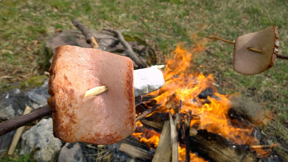 Die Feuerstelle ist schön gelegen und wir finden viel trockenes Holz. Zur Abwechslung braten wir heute Tomme und Fleischkäse.