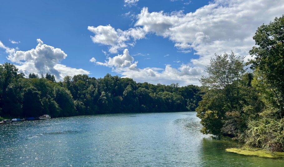 06.09.2025 Ohne Kinder bzw. Teenager wollen wir uns heute etwas bewegen aber wegen dem kaputten Knie nicht zu toll auf und ab. Wir starten in Raftz, folgen der Bahnline nach Deutschland, zweigen rechts ab, wandern kurz durch den Wald, passieren Solgen und sind in Deutschland. In Nack cremen wir uns mit Sonnenmilch ein und wandern hinunter zum Rhein. Hier könnten wir die Fähre nach Ellikon nehmen. Wir entscheiden uns den Rhein hoch zu spazieren. Die Wetterprognosen waren schlecht. Daher hat es hier wohl kaum Leute. Der Rhein hat viel Wasser. Uns gefällt es gut. Bei Blam machen wir am Rhein Pause auf einem schönen Bänkchen und wandern dann weiter nach Rheinau, wo wir einkaufen und den Bus nach Hause nehmen.